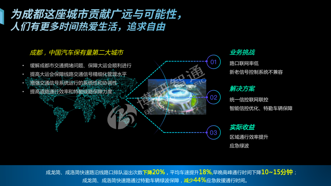 成都作为全国机动车保有量第二大城市,拥堵是交通头号问题,交通路口信号联网率低且多品牌信号不兼容……如何利用有限交通资源,实现精细化智慧化管理,降堵提效,是亟待解决的问题。通过建立统一信控管理平台,进行智能信号优化,实现特勤车辆出行保障等,如上困扰用户多年的问题,都一一被解决。